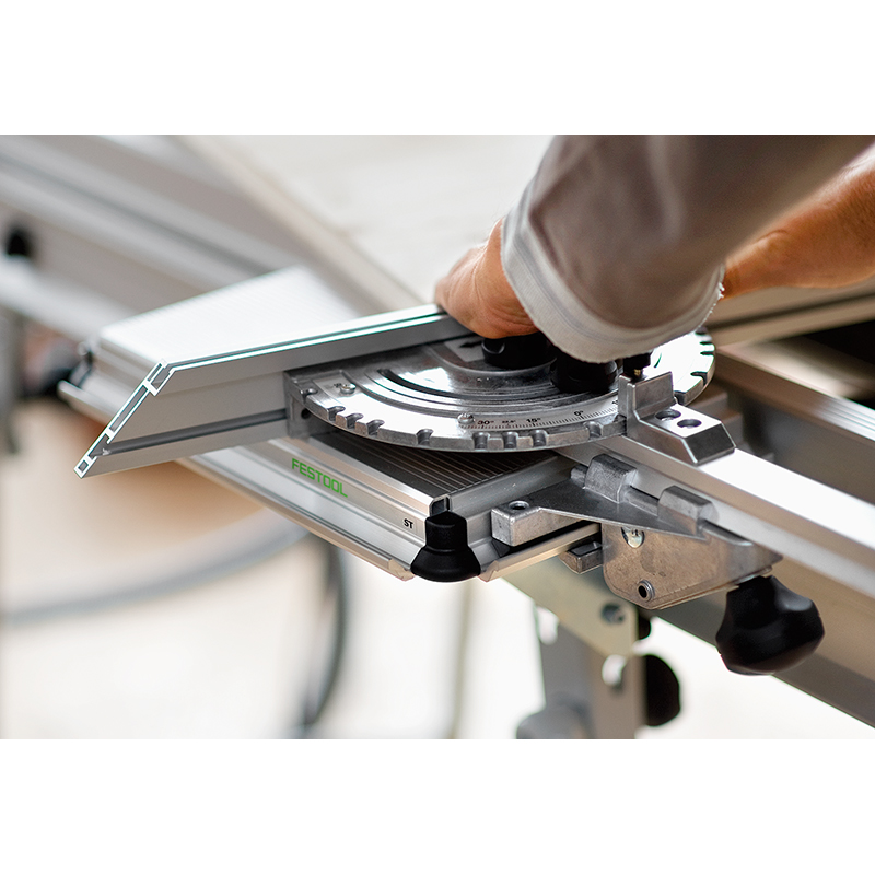 ta table coulissante permet de réaliser des coupes à l'équerre précises sur des pièces en combinaison avec la butée angulaire encliquetable correspondante de la CS 50, mais il est aussi possible de régler l'appareil sur n'importe quel autre angle. Ensuite, la table coulissante sert parallèlement d'extension supplémentaire du côté gauche de la scie circulaire sur table