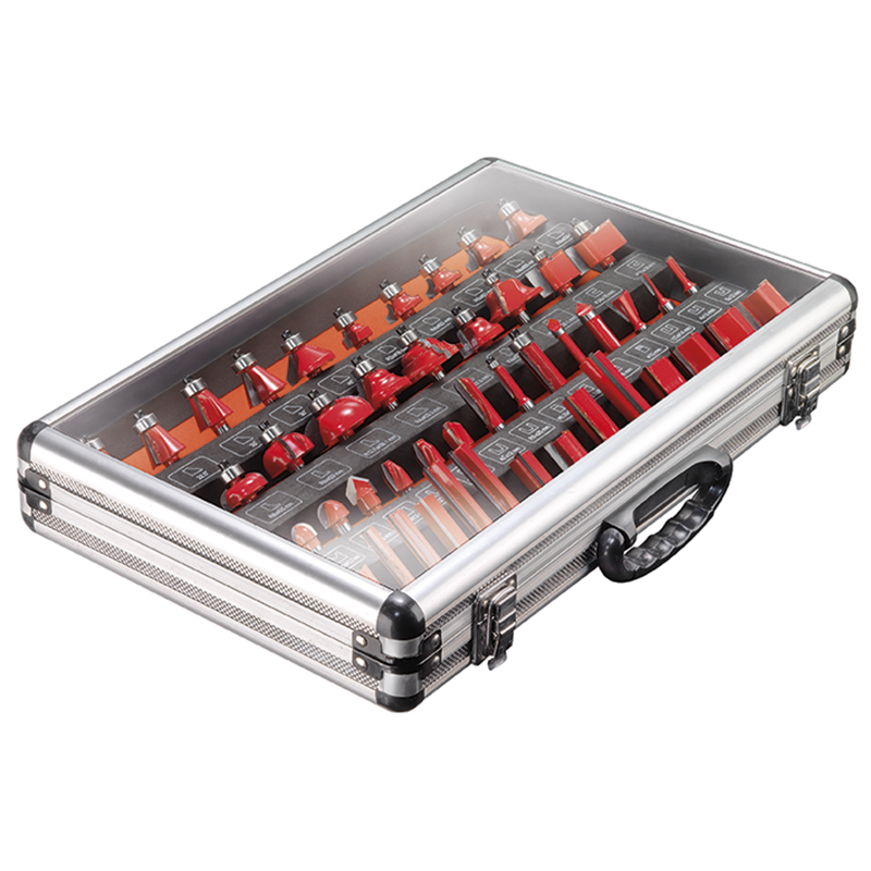 Jeu de fraises à rainurer 50 pièces, avec fraises revêtues de carbure HW, tige 8 mm, avec fraises spéciale pour rail à rideaux VS57, pour le joint de porte coulissante Planet, pour têtières de serrure, etc., emballé dans und bôite en bois pratique, comprenant: