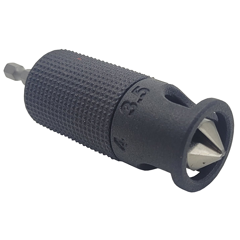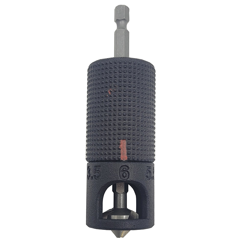 Chanfreinage simple et précis pour les têtes de vis, chanfreinage répétitif, convient pour toutes les vis courantes à tête fraisée et à tête bombée, pour des diamètres de vis de 3.5 à 6 mm, bois massif tendre et dur, divers matériaux de panneaux, boîtier robuste en PVC, butée tournante pour une profondeur de chanfreinage parfaite, réglage au pas de 0.25 mm pour des résultats précis, échelle pour le diamètre des vis, repère pour le positionnement, goupilles élastiques intégrées pour un réglage stable, pas de rayures sur les pièces à usiner, la fraise conique est interchangeable, avec fraise conique HS 90° intégrée