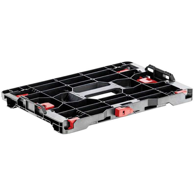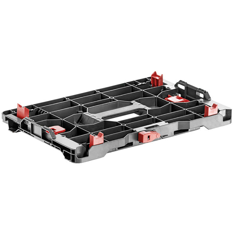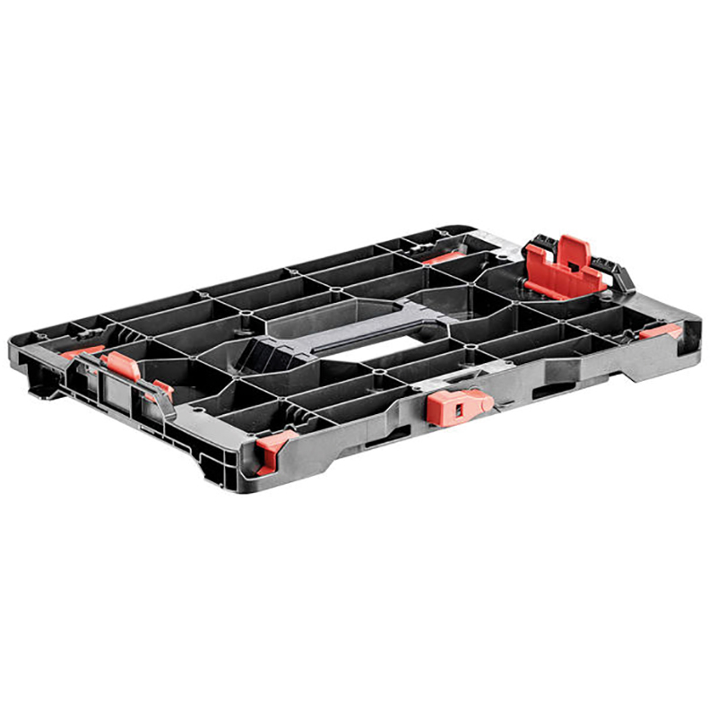 Plaque d'adaptation pour relier les Metabox aux systèmes de valises d'autres fabricants. Grâce aux différents compartiments de la plaque, elle peut également être utilisée comme organisateur de petites pièces. Les trous de vis peuvent également être utilisés de manière polyvalente. Par exemple pour le montage d'un plateau en bois qui peut être utilisé comme table de travail.