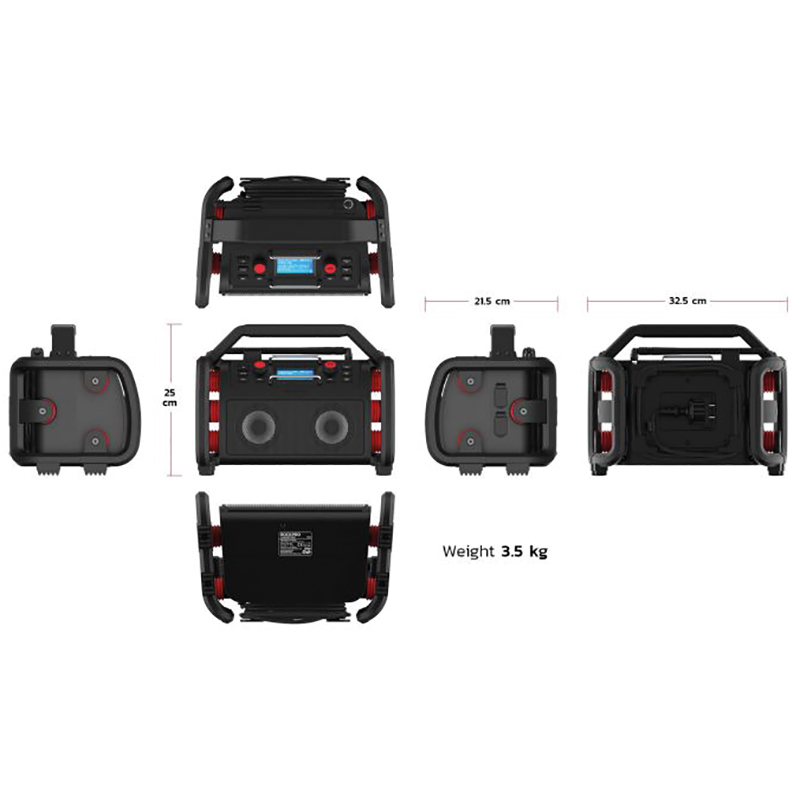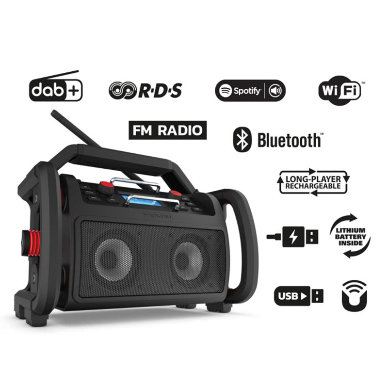 Boîtier en plastique ABS résistant aux chocs, grille de haut-parleur en métal, boîtier entièrement protégé avec poignée, câble d'alimentation en caoutchouc néoprène de 3 mètres, compartiment de rangement du câble et, support de fiche à l'arrière de la radio, support métallique pour la protection de l'écran, antenne flexible et rabattable avec amplificateur, traitement numérique du son, égaliseur, commande séparée du son (graves-trebles), prise pour casque, avec bloc d'alimentation et adaptateur de charge