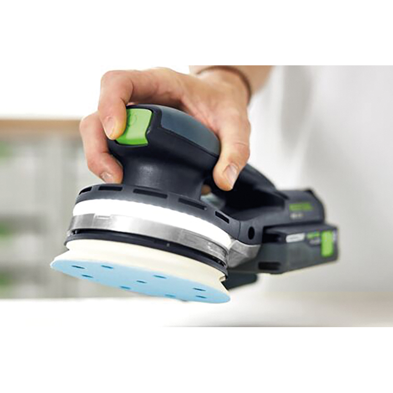 la première ponceuse excentrique sans fil à une main avec anneau lumineux intégré se distingue par son ergonomie optimisée et sa faible hauteur, ce qui permet de travailler directement sur la surface et d'assurer un contrôle optimal même dans les zones étroites, la puissance de 18V dans le système Festool permet de passer sans problème des batteries aux machines, deux modes d'éclairage, éclairage complet ou lumière tamisée, offrent des solutions d'éclairage individuelles, avec l'App Festool, l'éclairage peut être atténué individuellement en continu et la durée d'éclairage peut être réglée, de sorte que la surface peut être vérifiée à nouveau après le ponçage, le moteur EC-TEC sans balais est robuste, puissant et en même temps particulièrement silencieux et ne nécessite que peu d'entretien, le frein à disque équipé de carbure de tungstène empêche une accélération incontrôlée en marche à vide, garantit une amorce sans stries et évite des retouches coûteuses, la protection contre les vibrations assure un travail agréable sans fatigue prématurée des mains, sans batterie, sans chargeur,