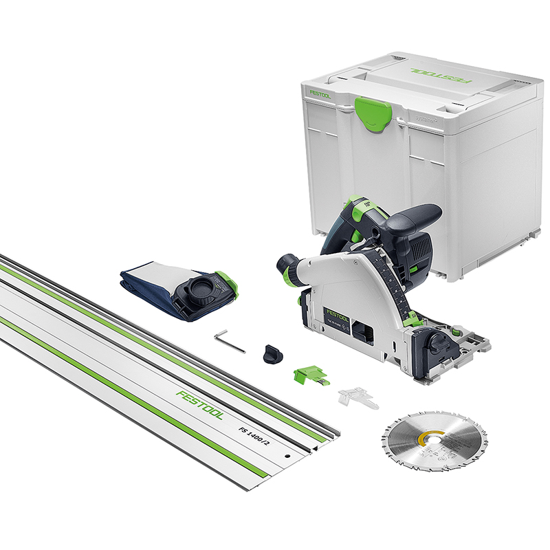 Contenu de la livraison: lame de scie circulaire HW 160 x1,6 x 20 mm, sac à poussière, fenêtre de contrôle, pare-éclats, clé mâle coudée pour vis à six pans creux SW5, rail de guidage FS 1400/2, Systainer SYS M 337