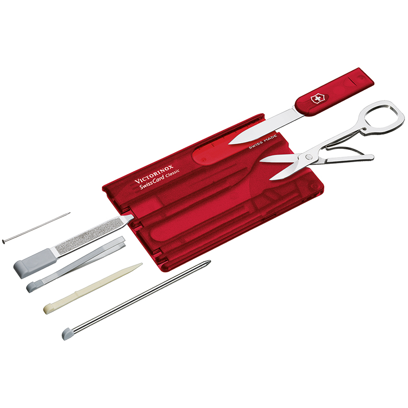 rouge transparent, le compagnon pratique à glisser dans votre portefeuille avec 9 outils, fabriqué en Suisse
