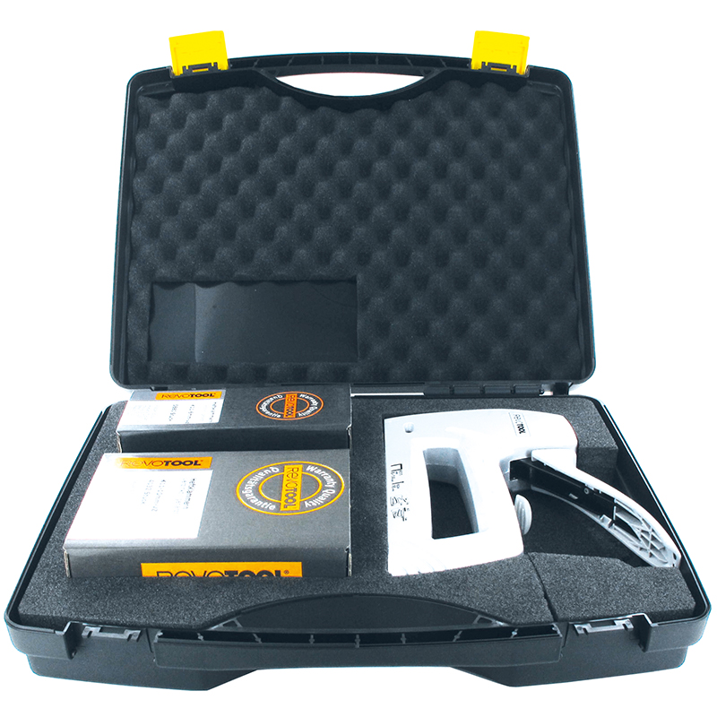 fonte d'aluminium de couleur argentée, pour usage professionnel, avec résistance aux chocs réglable, poignée en caoutchouc antidérapante pour une meilleure ergonomie et manipulation, forme spéciale pour un travail sans fatigue, avec système de blocage de sécurité, outil combiné pour clous 16 mm et agrafes 6 - 14 mm, dans un coffret en plastique avec 1 paquet d'agrafes de 6 et 10 mm