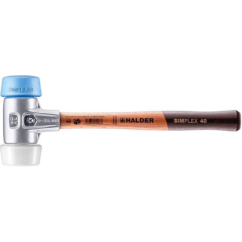 Marteau de protection SIMPLEX dans la combinaison d'utilisation TPE-soft (bleu, souple, anti-abrasif) / superplastique (blanc, mi-dur, très résistant), Boîtier en aluminium extra-léger avec douille de protection du manche intégrée permettant à l'utilisateur de bien contrôler et de déterminer lui-même la force de frappe (idéal pour les matériaux sensibles à la casse), manche en bois de haute qualité, amortissant les vibrations et de forme ergonomique ; zone de la poignée doublement laquée (insensible à la saleté), toutes les pièces sont interchangeables / peuvent être montées ultérieurement, donc très économiques et préservant les ressources