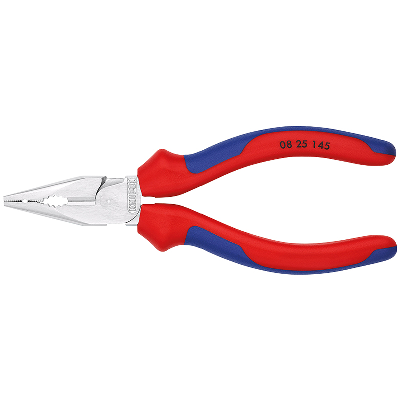 Pince universelle compacte à forte démultiplication à mâchoires en pointe, pour tous travaux usuels d’installation et de réparation, maniable pour travailler dans des zones difficiles d’accès grâce à la forme effilée de sa tête, à mâchoires en pointe (protection anti-inversion), mors à contour convexe d‘un côté pour saisie en toute sécurité de pièces plates, rainurage fraisé dans la zone de préhension, permettant de bien maintenir et tirer de petites pièces, telles que pointes, clous et boulons, la pince universelle multifonctions fiable et polyvalente des nomades, coupe facile grâce à son articulation à forte démultiplication, avec tranchants pour fils doux, mi-durs et durs, tranchants trempés par induction, dureté d'env. 61 HRC, grande longévité et becs solides, forgé en acier à outil spécial de haute qualité, trempé à l'huile en plusieurs phases, Poignées multi-composants