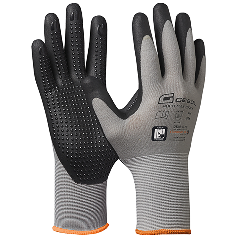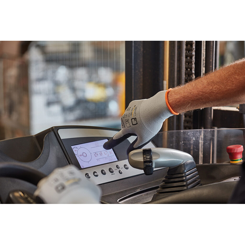 gant de montage léger et sans couture avec revêtement en micromousse de nitrile et boutons en nitrile sur la paume de la main, spécialement conçu pour le fonctionnement de l'écran tactile grâce à la fibre de cuivre dans l'index et le pouce, revêtement respirant, dextérité optimale, grand confort de port