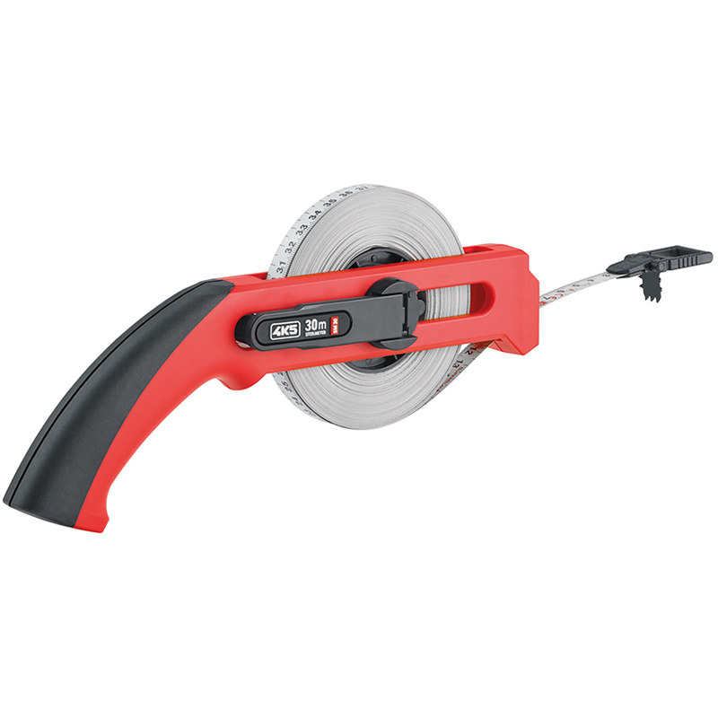 convient pour les mesures à grande distance, crochet d'extrémité mobile et fixation efficace, une seule personne est nécessaire pour le processus de mesure, graduation continue et bien lisible, différentes graduations au recto et au verso adaptées à chaque situation d'utilisation, enroulement rapide par manivelle, utilisation confortable grâce à la poignée ergonomique