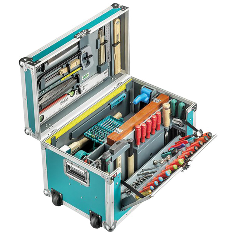 La caisse à outils de charpenterie CARPENTER PRO 184 pièces est le compagnon ultime de tout charpentier professionnel. Fabriquée en construction légère et robuste, elle contient une sélection exclusive d'outils de marque de PB SWISSTOOLS, KNIPEX, BAHCO, RALI et technocraft. Grâce aux roulettes intégrées et à un tiroir pratique pour les petites pièces, elle allie mobilité, ordre et sécurité grâce à son design verrouillable.