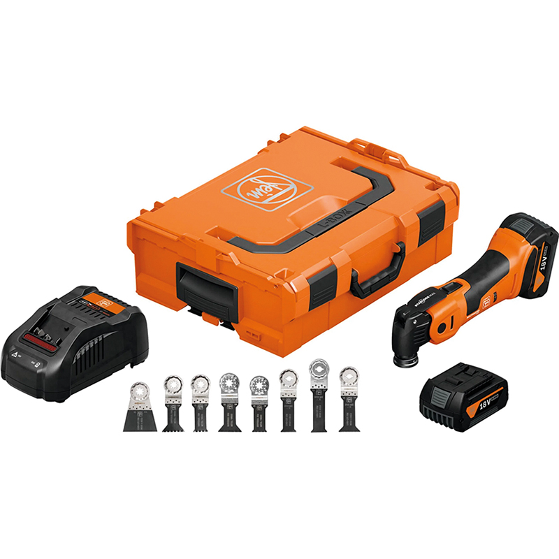 Accesoires fournis: 1 lame de scie E-Cut Universal 60 x 28 mm, E-Cut Universal 60 x 44 mm, E-Cut Universal 55 x 28 mm, E-Cut Universal 55 x 44 mm, E-Cut longlife 78 x 32 mm, E-Cut longlife 78 x 42 mm, E-Cut longlife 50 x 65 mm, E-Cut longlife 90 x 32 mm, 2x batteries 18V 5,0 Ah, chargeur, dans L-Boxx