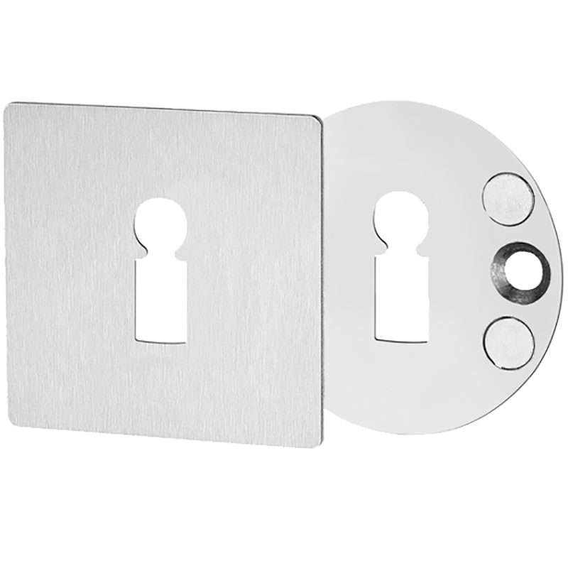 Acier inoxydable mat, rayon 2 mm, rosace extérieure hauteur 2 mm avec 2 ergots filetés M4 x 14 mm, rosace intérieure : plaque inférieure 1 mm avec 2 trous de vis et aimants et plaque de recouvrement 1 mm avec épaisseur de bord 2 mm, distance des trous de vis 38 mm, sans vis