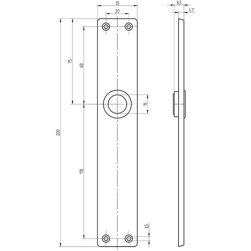 Zinc poli mat nickelé, guidage de béquille 16 mm, trou de vis supérieur jusqu'au milieu du guidage de béquille 68 mm