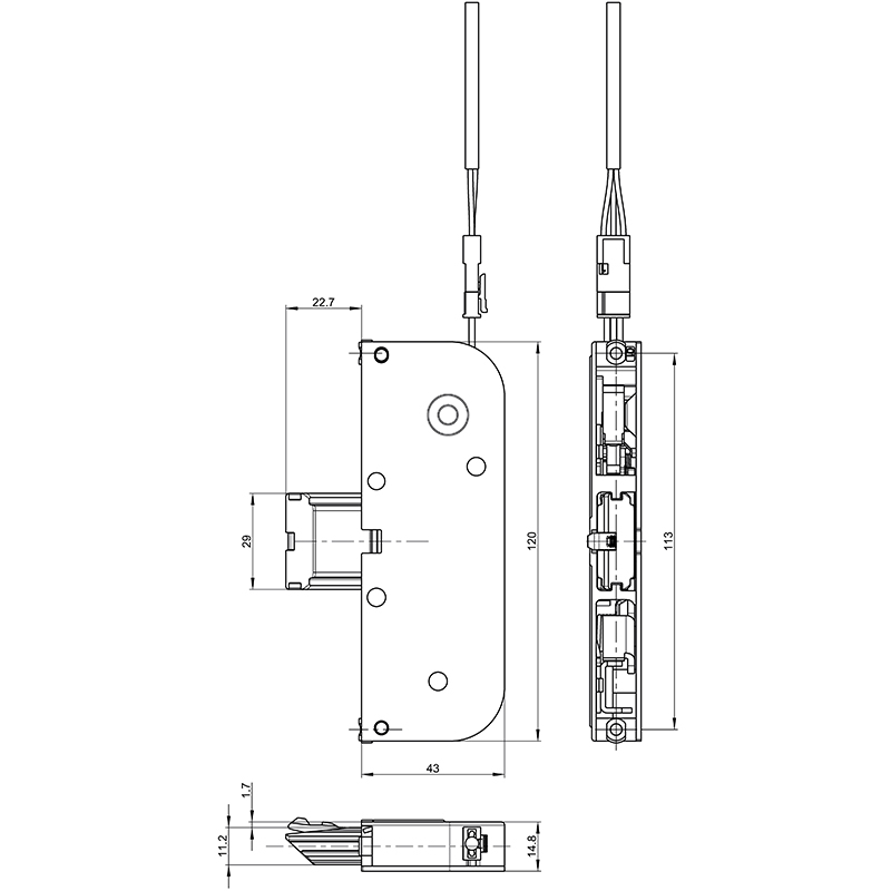 Pêne dormant en zinc moulé sous pression avec contact de surveillance, pour surveiller le pêne dormant automatique supérieur ou inférieur, le contact est fermé lorsque le pêne dormant est sorti, le contact inverseur assure la surveillance de l'état et signale la position ouverte ou fermée de la porte, la taille du pêne dormant automatique avec interrogation correspond à la taille standard d'un pêne dormant automatique, tension nominale 12 V AC ou 12 - 24 DC, consommation de courant max. 0,4 A, avec câble de raccordement de 6 mètres, un