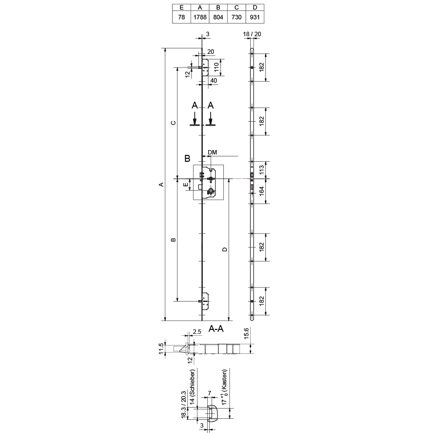 Hauteur de béquille 931 mm, sièges de pêne dormant en haut 730 / en bas 804 mm Homologué pour les essais dans la classe de résistance RC3 selon EN 1627-1630, DIN 18251, classe 3, EN 179 Portes de secours, EN 1125 Fonction anti-panique en combinaison avec garniture anti-panique GLUTZ 8615, conçue pour l'utilisation dans des portes coupe-feu : EI30, selon EN 1634-1