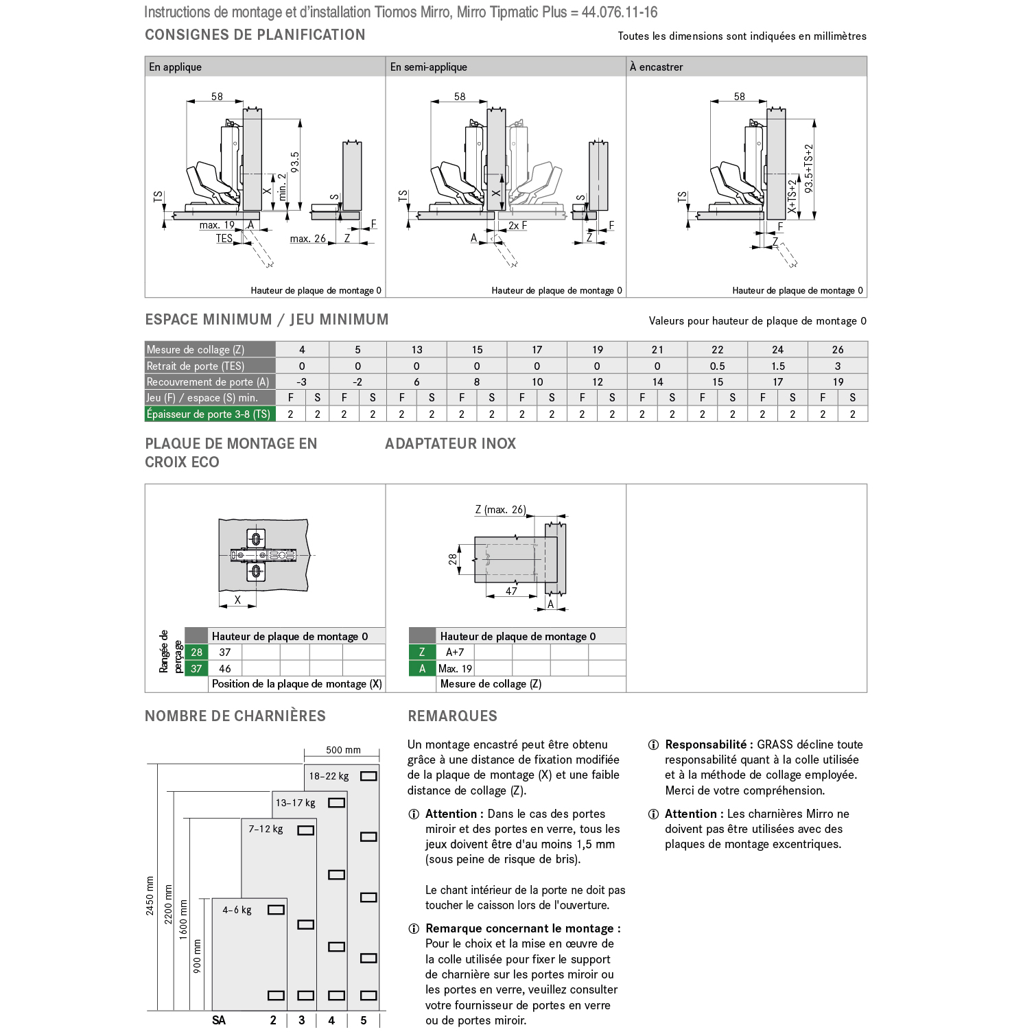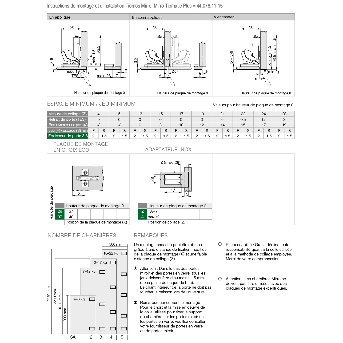 • Instruction relative à la mise en oeuvre: Pour obtenir des informations sur le choix et la mise en oeuvre de la colle pour la fixation du support de charnière sur les portes en miroir et en verre, veuillez vous adresser au fournisseur des portes en miroir ou en verre.
