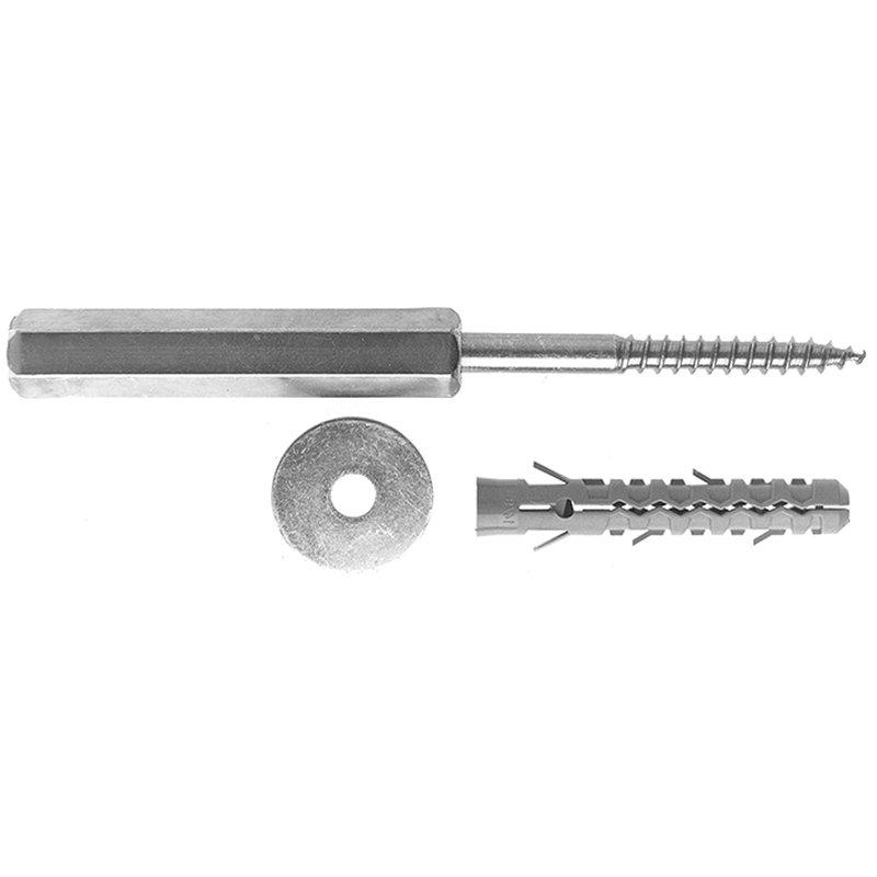 Acier galvanisé, montant avec filetage bois 10 mm, douille avec filetage intérieur M10, avec cheville nylon Ø 14 x 90 mm