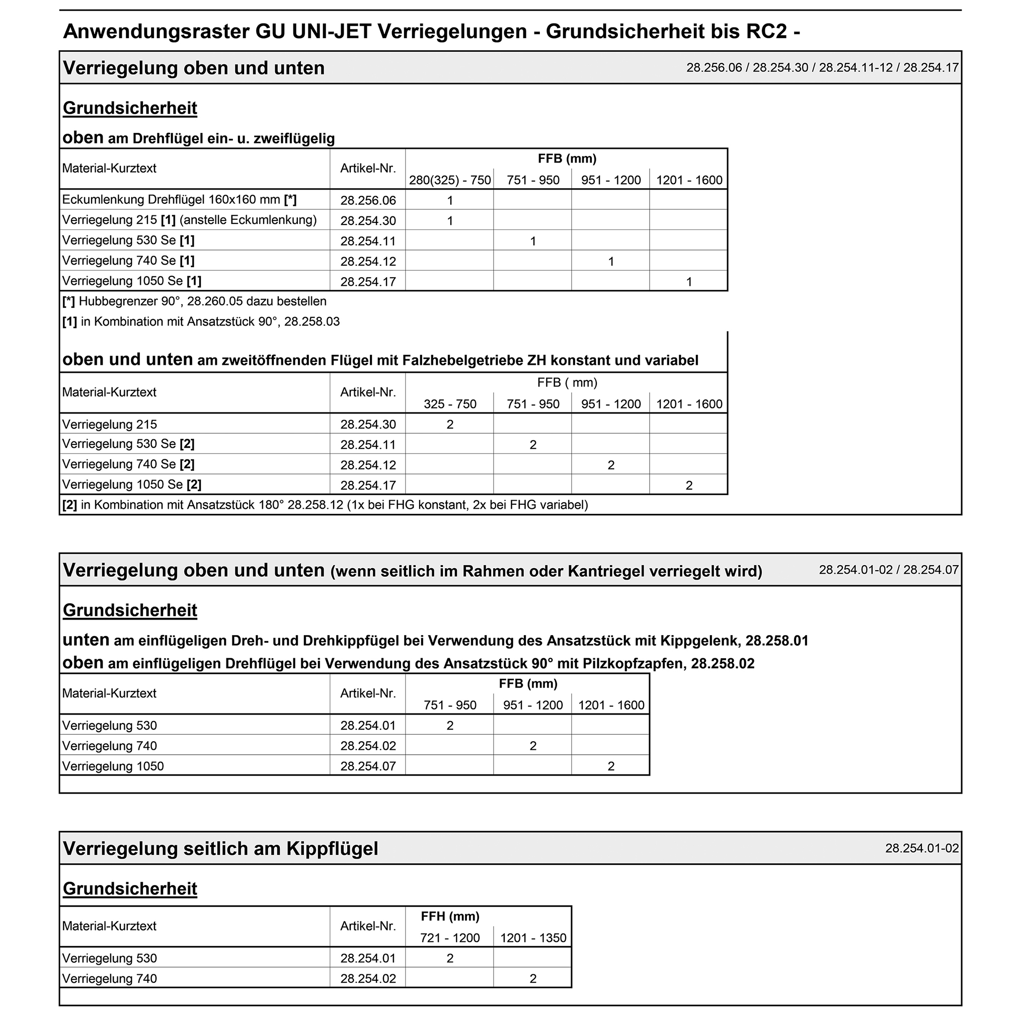 - Grille d'application des verrouillages GU UNI-JET, voir Info.
