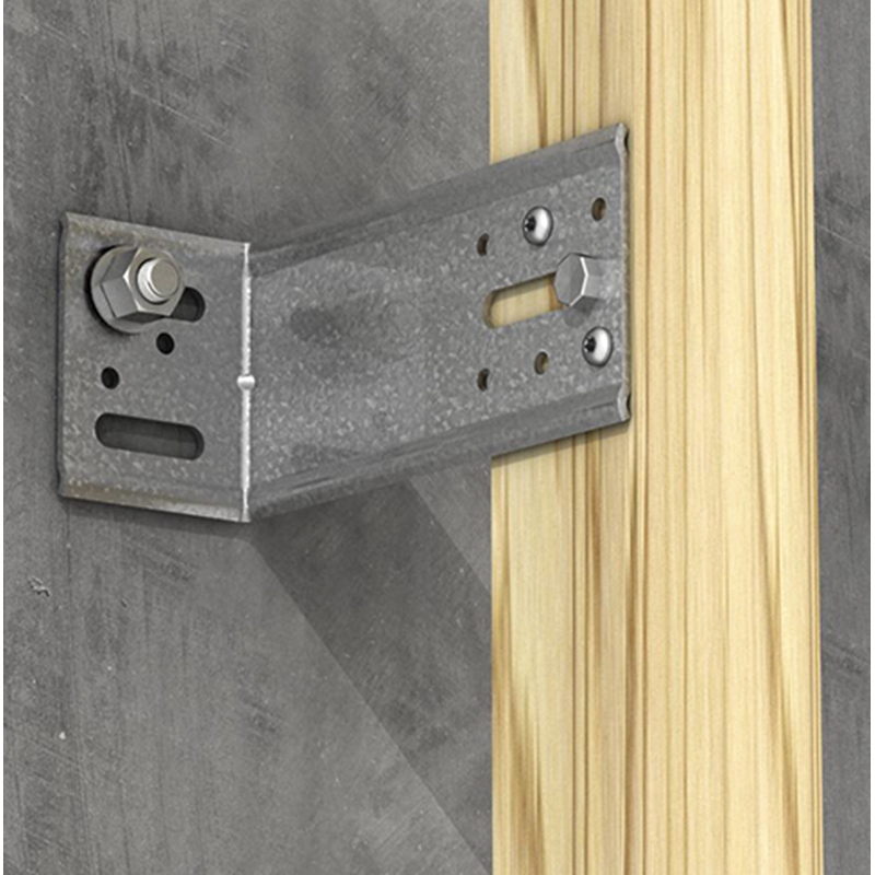Tôle d'acier galvanisée à chaud, particulièrement adaptée au montage à distance de constructions en bois sur du béton / de la maçonnerie, liaison directe de la construction au support, crée un niveau d'isolation et une ventilation arrière, particulièrement stable dimensionnellement grâce aux nervures latérales, compensation des inégalités dues au trou oblong,