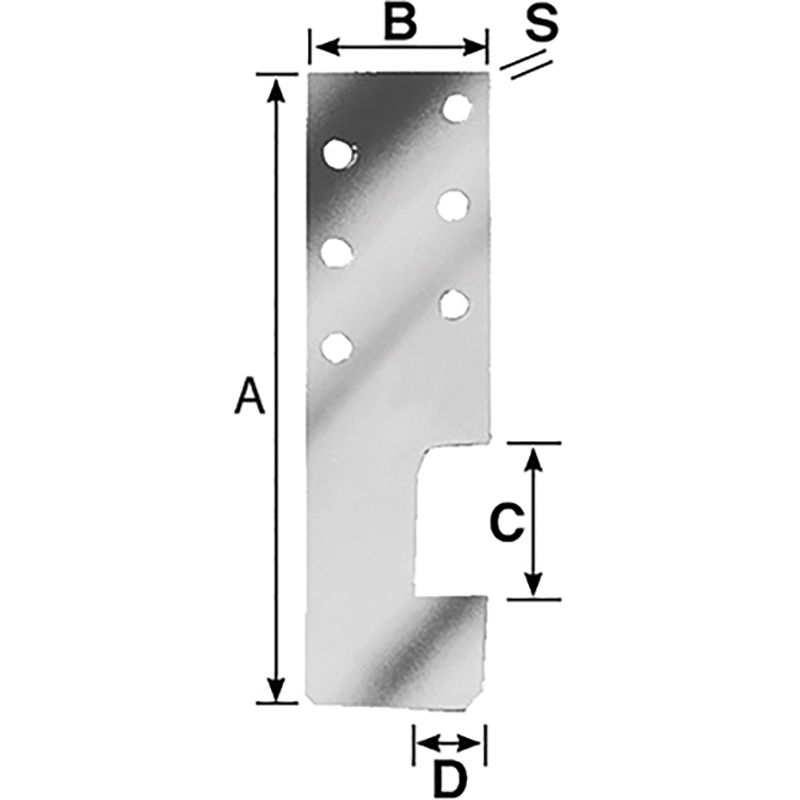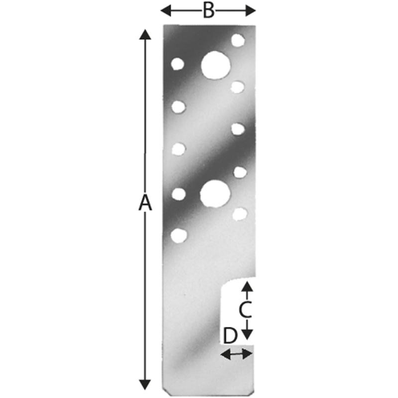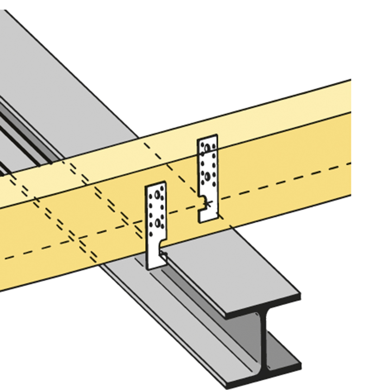 Tôle d'acier galvanisé à chaud, utilisé pour l'ancrage de charpentes et de planchers en bois sur des poutres métalliques pour palier transversal, épaisseur du matériau 4 mm, Ø de perforation par clou 5 mm