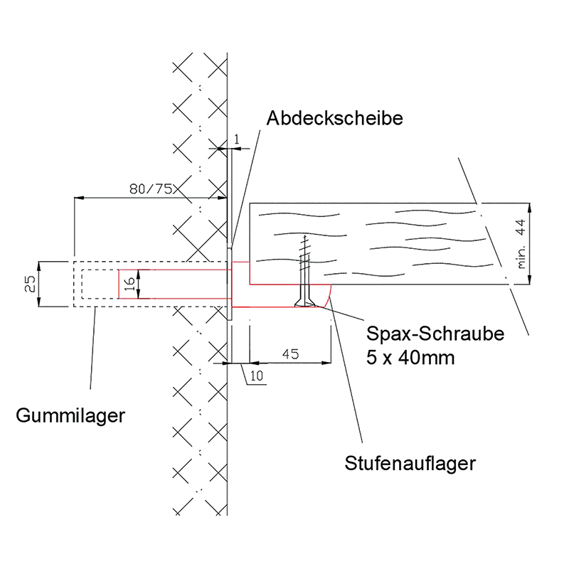 1x support de marche, avec tourillon de montage de 60 mm de long à insérer dans le support en caoutchouc, support de marche 45 mm, distance au mur 10 mm
