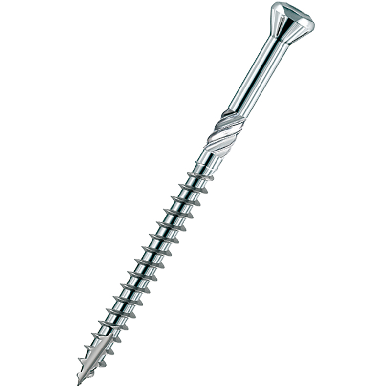 Inox trempé martensitique, acier à faible vitesse de corrosion, à tête fraisée bombée 60°, avec Torx, avec coche de taraudage, filet alésé et nervures de fraisage pour bois et matériaux dérivés du bois, pour la fixation de panneaux sur des structures portantes en bois, homologations ETA-11/0024