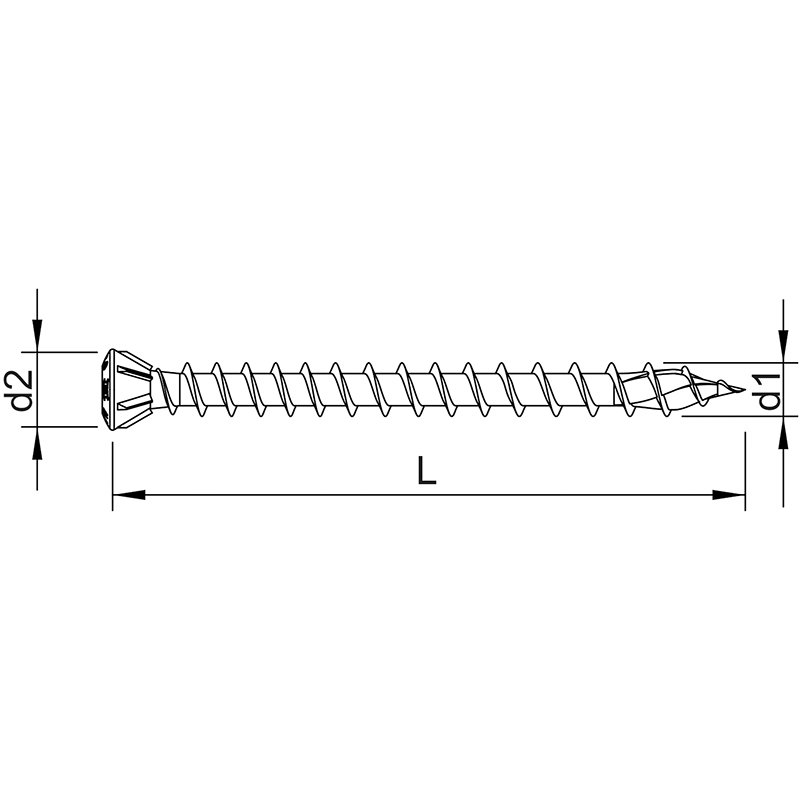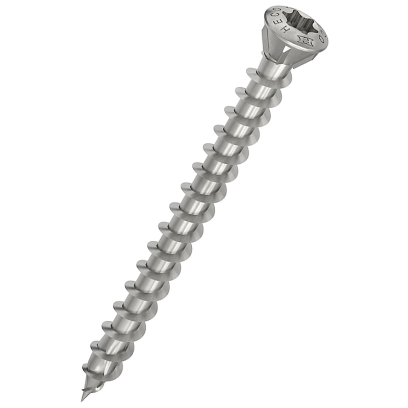 inox A2, filetage plein, avec Torx, avec poche fraisée, enfoncement facile de la tête dans le ressort avec un effet d'étalement réduit, la pointe rend le pré-perçage inutile, pas de craquement du planches, possibilité de réduire les distances entre les bords et les centres, GripFit (pour le travail d'une seule main), MagicClose (filet total breveté qui contracte les éléments en bois sans interstice et sans précontrainte), et PerfectPitch (un pas de filetage optimal pour toutes les longueurs de vis), autorisation ETA-19/0553