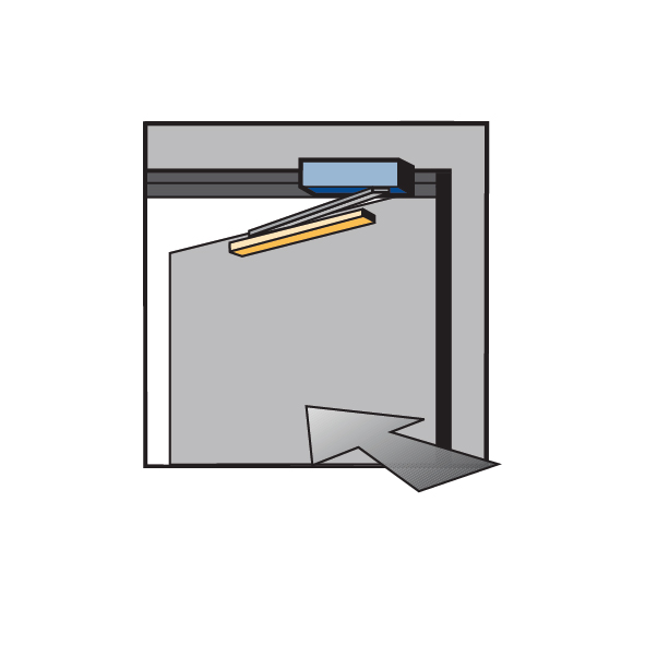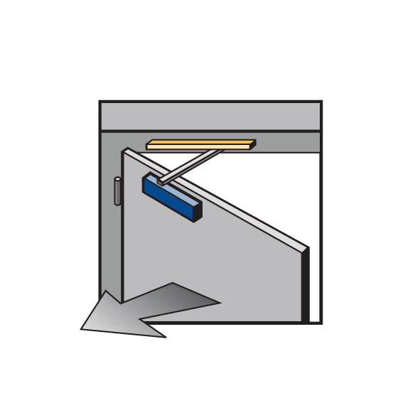 Ferme-porte à mécanisme à crémaillère en applique avec amortissement d'ouverture, force de fermeture réglable, amortissement d'ouverture, butée et vitesse de fermeture réglables par l'avant, vitesse de fermeture intégrée et réglable en continu de 0 à 15° d'ouverture de porte, particulièrement adapté aux zones sensibles au bruit, même en cas de variations de pression, à monter sur le battant de porte côté fiche ainsi qu'en haut de la porte côté opposé à la fiche