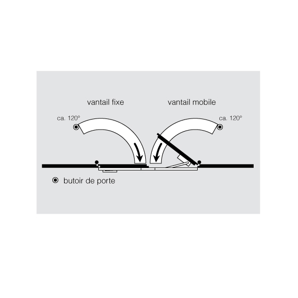 avec régulation d'ordre de fermeture mécanique intégrée pour portes à 2 vantaux, lors de la fermeture de la porte, le vantail de service reste en position d'attente jusqu'à ce que le vantail dormant soit fermé et débloque le vantail de service via la régulation d'ordre de fermeture, montage côté opposé à la fiche