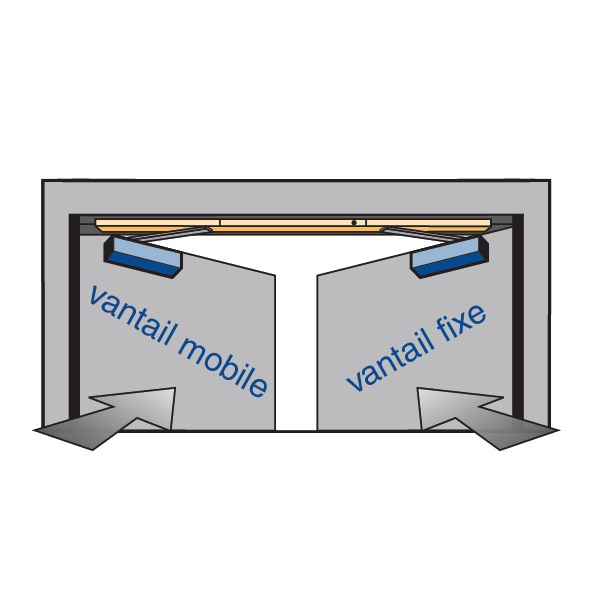 avec régulation mécanique intégrée d'ordre de fermeture pour portes à 2 vantaux et blocage électromécanique des deux côtés réglable en continu entre 80° env. et 130° et centrale de détection de fumée intégrée avec indicateur d'encrassement, si, portes ouvertes, la porte est fermée alors que les vantaux de porte sont bloqués en position E, le vantail de service reste dans sa position d'attente jusqu'à ce que le vantail de service soit également fermé et débloque le vantail dormant via la régulation d'ordre de fermeture, tension de service 230 V CA, montage sur battant de porte côté opposé à la fiche