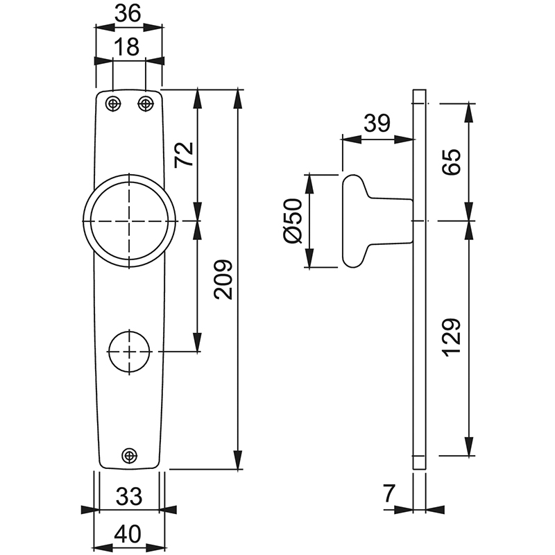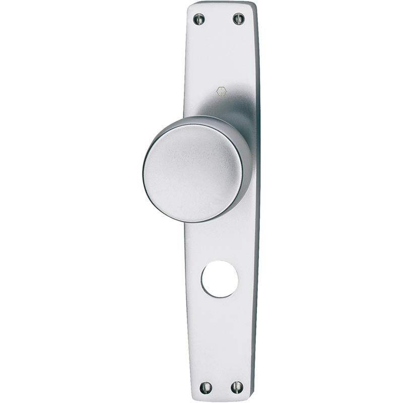 Aluminium éloxé incolore F1, bouton avec filetage fin M12, trou de vis supérieur jusqu'au milieu du guidage de la béquille 65 mm, avec vis à bois Ø 3,5 x 20 mm