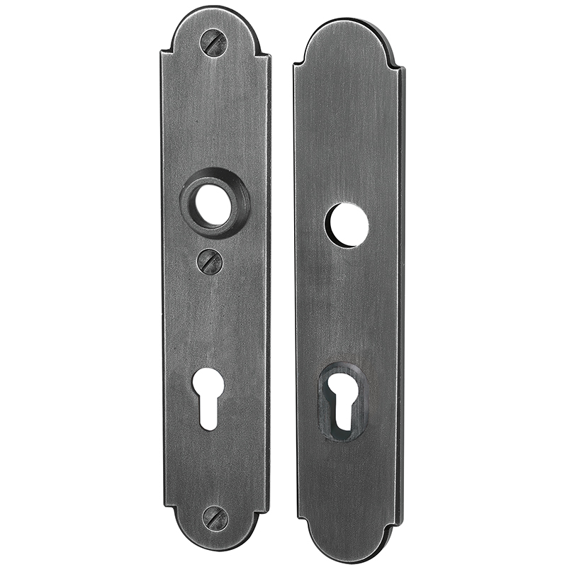 Fer zingué et patiné vieux sans vis, avec plaquette anti-percement et rosace de protection pour le cylindre, distance du milieu du trou de vis du haut au milieu du trou de poignée 74,5 mm
