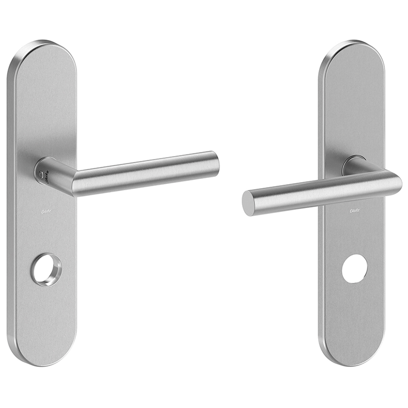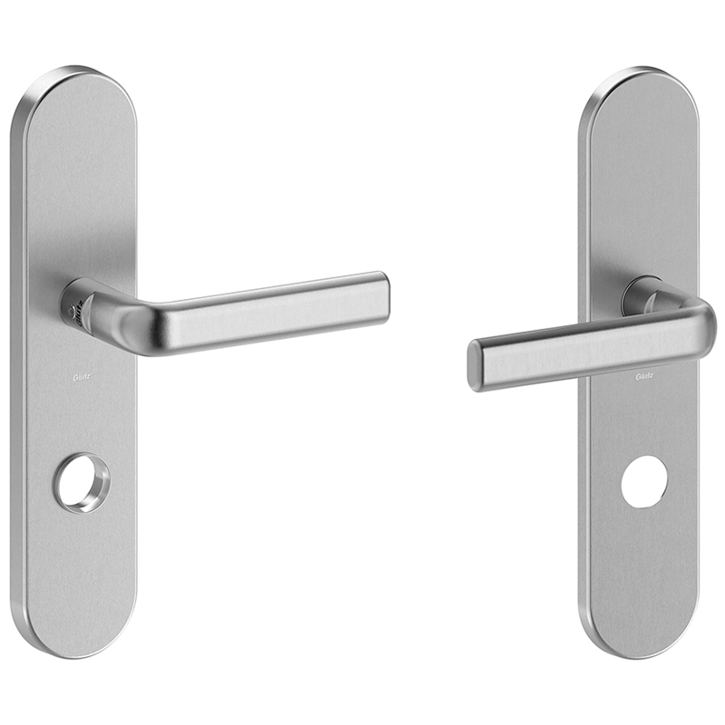 Surface en acier inox mat, avec 3 cames de guidage/filetage, utilisable sur des portes anti-effraction RC1, testé selon EN 1627-1630, convient pour une épaisseur de porte de 46 à 76 mm, garniture composée d'une plaque extérieure, d'une plaque intérieure et d'une paire de béquilles avec tige carrée 9 x 109 mm,sans kit de vis, sans insert de protection