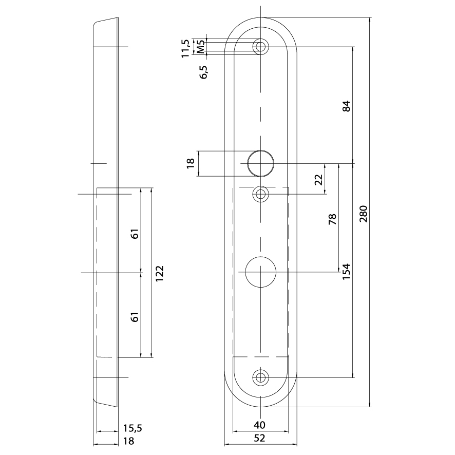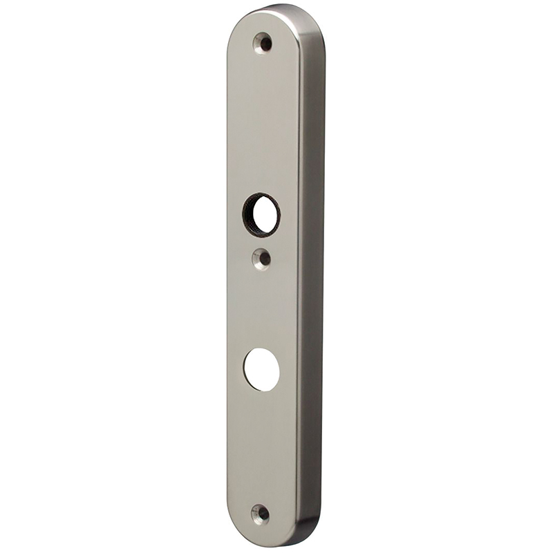 Zinc poli mat nickelé, guidage 18 mm avec réduction en nylon 16 mm, épaisseur 18 mm, avec 3 trous de vis, pour recouvrir les modules électriques Kaba elostar, milieu du trou de vis supérieur jusqu'au milieu du guidage de la béquille 84 mm, sans vis