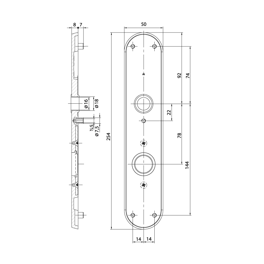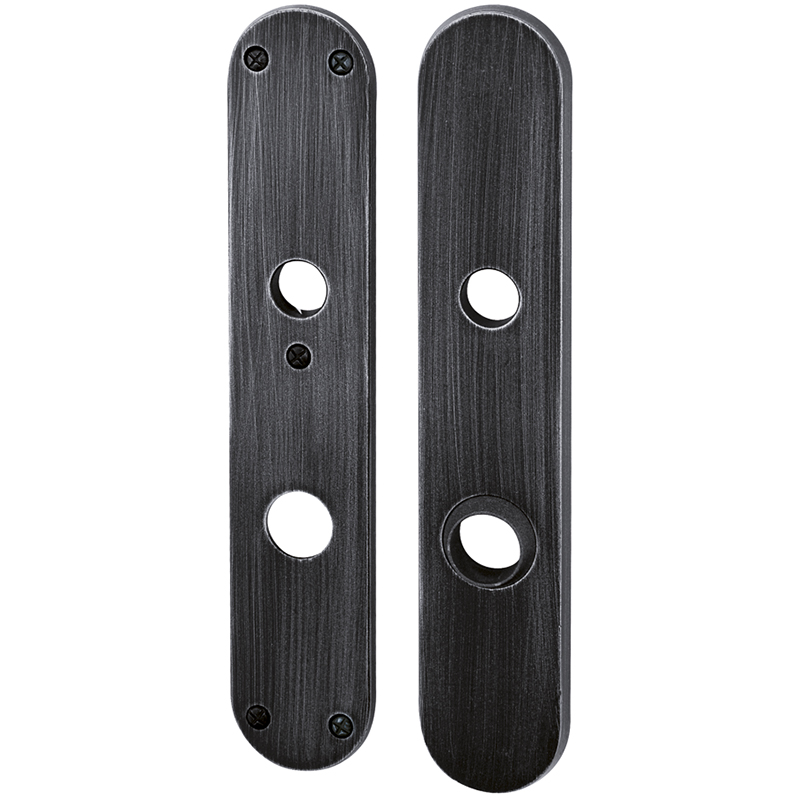 acier galvanisé et patiné, guidage 18 mm avec réduction en nylon 16 mm, plaque extérieure avec plaque en acier trempé dans la zone du cylindre, avec 5 ergots filetés M5 x 7 mm pour vissage par paire avec plaque intérieure 5 mm, milieu du trou de vis supérieur jusqu'au milieu du guidage de la béquille 74 mm, sans insert de protection, sans vis