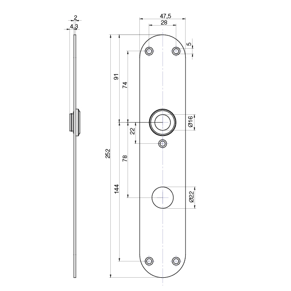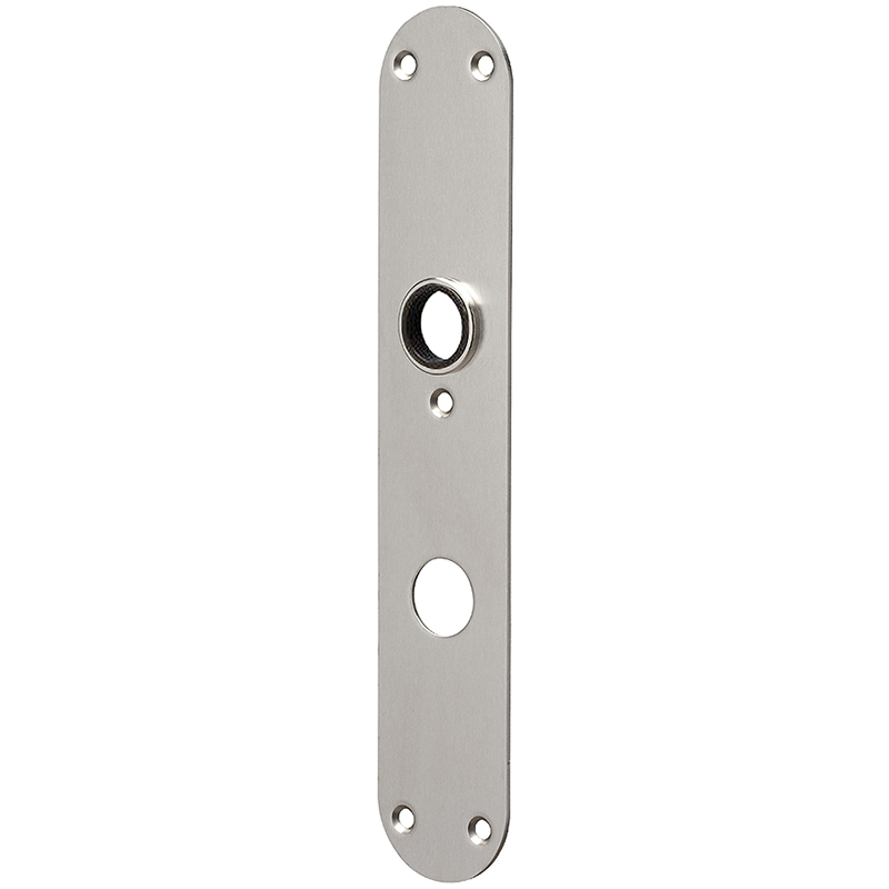 Acier inox mat, guidage 18 mm avec réduction en nylon 16 mm, percé pour vis M5 pour vissage par paire avec plaque extérieure de sécurité, pour harmonisation optique si des plaques plates en acier inox sont utilisées à l'intérieur, milieu du trou de vis supérieur jusqu'au milieu du guidage de la béquille 74 mm, sans vis