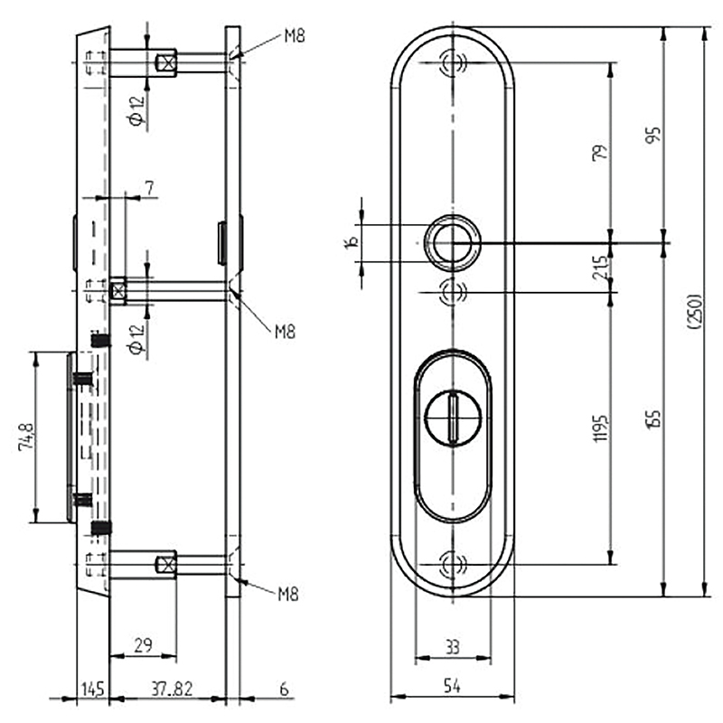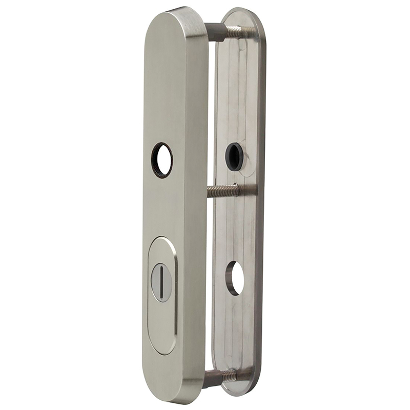 zinc dépoli mat nickelé, guidage 18 mm avec réduction en nylon 16 mm, plaque extérieure avec plaque en acier trempé au niveau du cylindre, avec 2 raccords filetés M8 x 29 mm et 1 raccord fileté M8 x 7 mm pour vissage par paire, avec plaque intérieure 6 mm, centre du trou de vis supérieur jusqu'au centre du guidage de poignée 74 mm, avec plaque de protection 6 - 12mm, sans jeu de vis