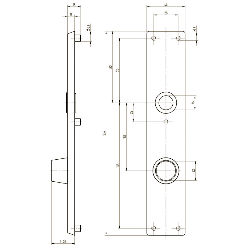 zinc dépoli mat nickelé, guidage 18 mm avec réduction en nylon 16 mm, plaque extérieure avec plaque en acier trempé au niveau du cylindre, avec 5 raccords filetés M5 x 7 mm pour vissage par paire avec plaque intérieure 5 mm, centre du trou de vis supérieur jusqu'au centre du guidage de poignée 74 mm, sans plaque de protection, sans vis