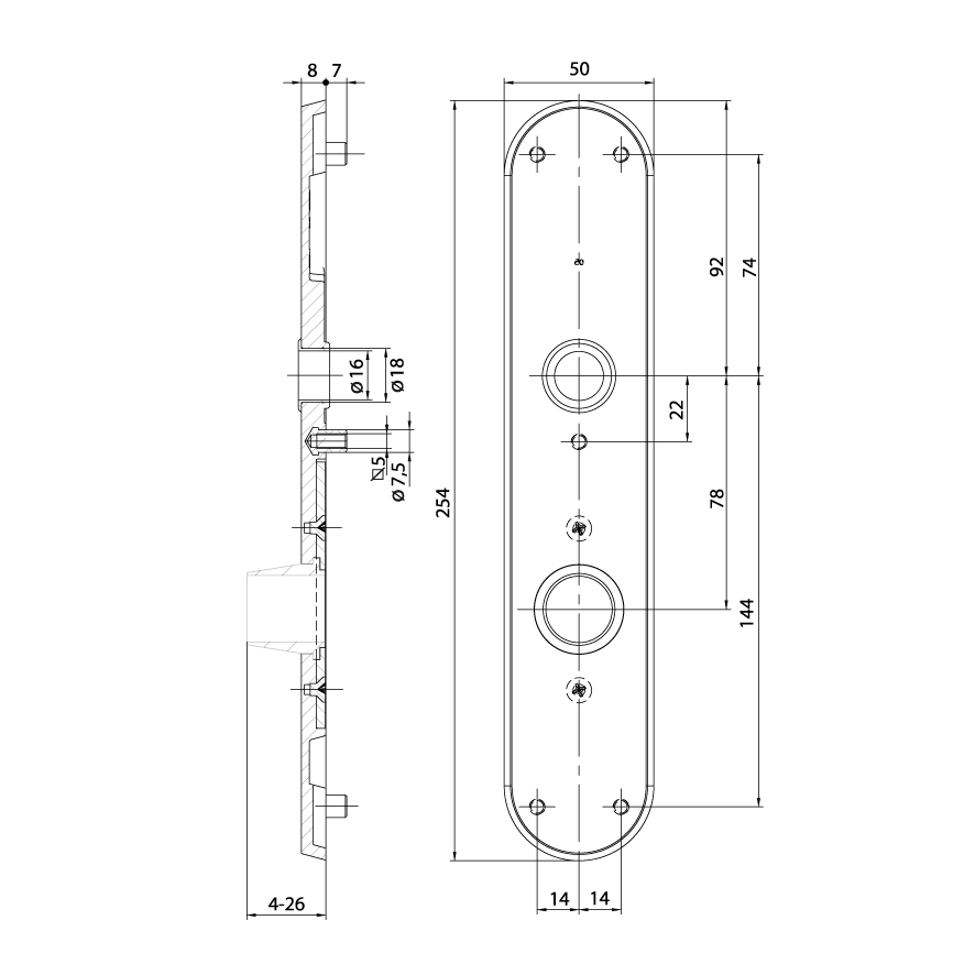 zinc poli doré, guidage 18 mm avec réduction en nylon 16 mm, plaque extérieure avec plaque en acier trempé dans la zone du cylindre, avec 5 ergots filetés M5 x 7 mm pour vissage par paire avec plaque intérieure 5 mm, milieu du trou de vis supérieur jusqu'au milieu du guidage de béquille 74 mm, sans insert de protection, sans vis