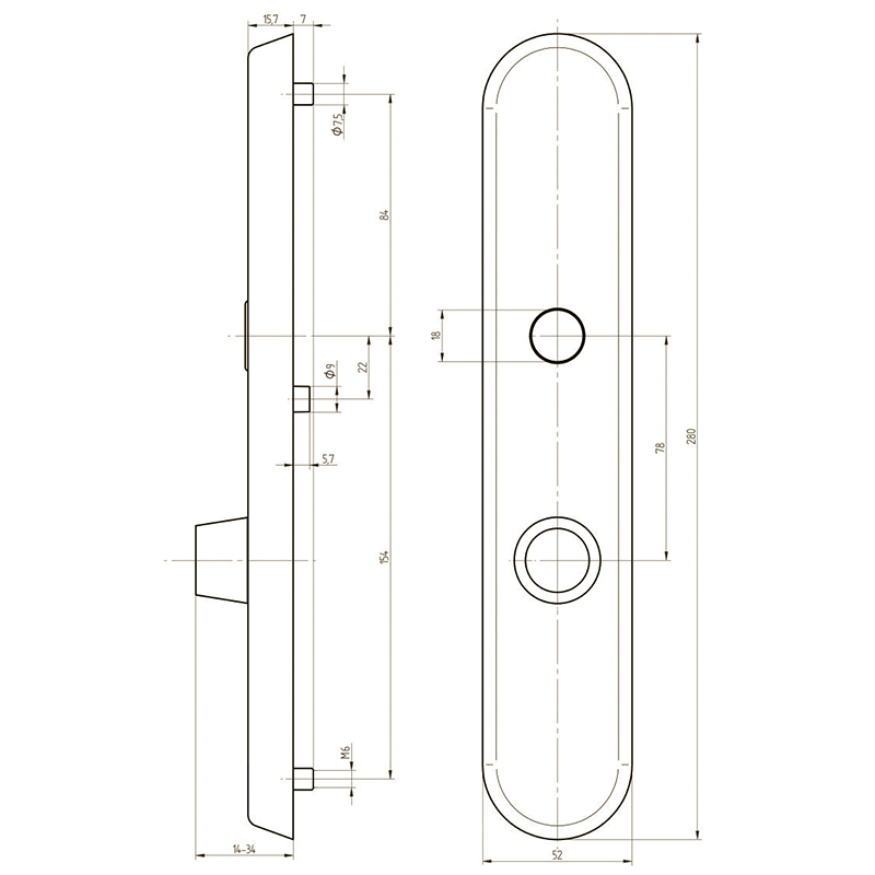 zinc poli mat nickelé, guidage 18 mm avec réduction en nylon 16 mm, plaque extérieure avec plaque en acier trempé dans la zone du cylindre, avec 3 ergots filetés M6 x 7 mm pour vissage par paire avec plaque intérieure 5,2 mm, milieu du trou de vis supérieur jusqu'au milieu du guidage de la béquille 84 mm, sans insert de protection, sans vis