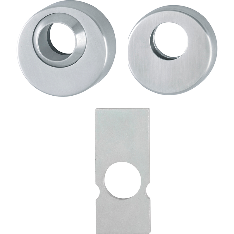 Acier inoxydable mat (F69), préparé pour une utilisation en protection, plaque en acier séparée avec pastille adhésive pour fixation à la serrure de porte comme protection contre le perçage, décalée de 6,5 mm, avec vis de fixation pour épaisseur de porte 57 - 62 et 67 - 72 mm, testé selon DIN 18257 ES1 (SK2), sans insert de protection