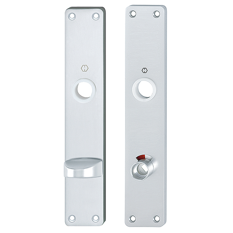 Aluminium anodisé incolore F1, guidage de béquille 18 mm, plaque intérieure avec olive rotative et goupille 7 mm, plaque extérieure avec affichage rouge / blanc et ouverture de secours, trou de vis supérieur jusqu'au milieu du guidage de béquille 75 mm, avec vis à bois Ø 3,5 x 20 mm