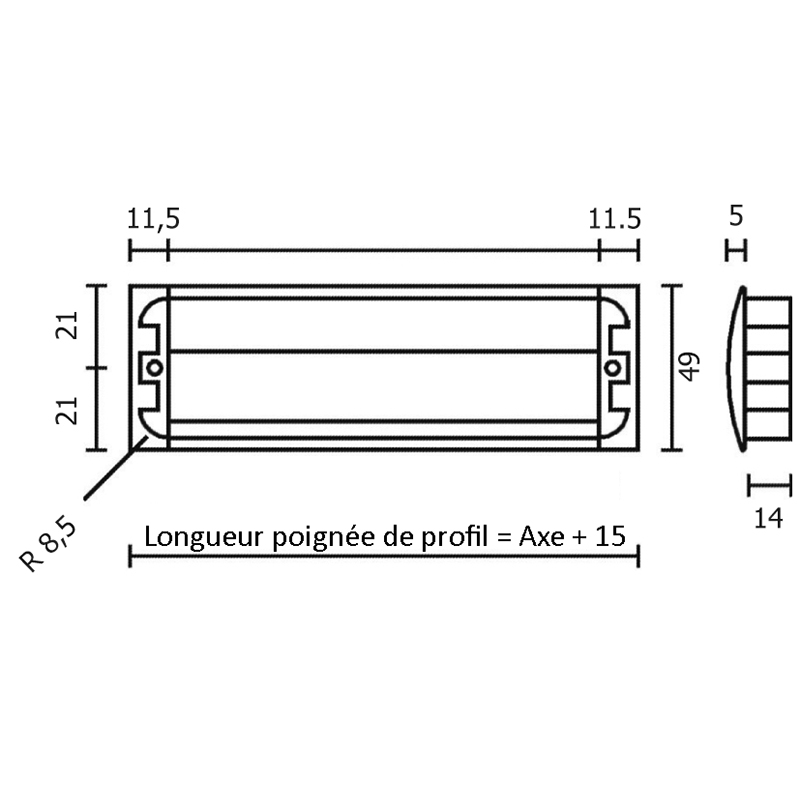- Fraisure: longueur = axe + 9 mm, largeur = 42 mm, profondeur = 14,5 mm.