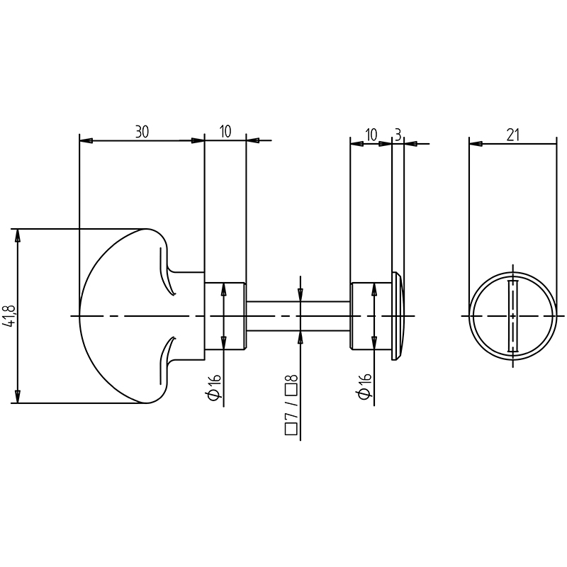 laiton dépoli mat nickelé, sans affichage, comprenant d'une olive femelle avec trou carré 7 mm et d'une tête fendue avec broche carrée fixe 7 x 67 mm, largeur x hauteur 42 x 30 mm