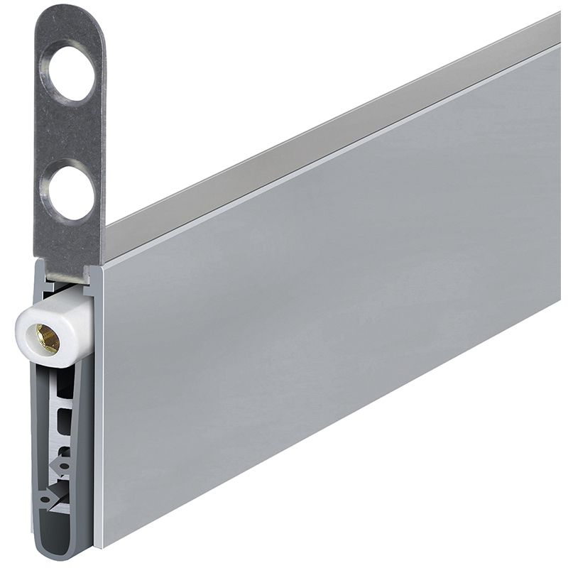 joint de porte abaissé automatique pour portes antibruit et anti-fumée, déclenchement côté paumelle avec compensation automatique en cas de sol incliné, abaissement parallèle, hauteur du joint jusqu'à 20 mm, lèvre en silicone, valeur d'isolation acoustique 48 dB pour une distance au sol de 7 mm, à encastrer à fleur ou plus bas avec protection de la lèvre, avec kit de montage pour montage latéral