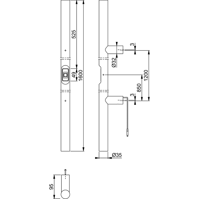 Acier inoxydable, forme de barre avec lecteur d'empreintes digitales, supports : ronds, droits, pour fixation d'un côté sur portes en bois, aluminium et PVC, épaisseur du vantail de porte min. 56 mm