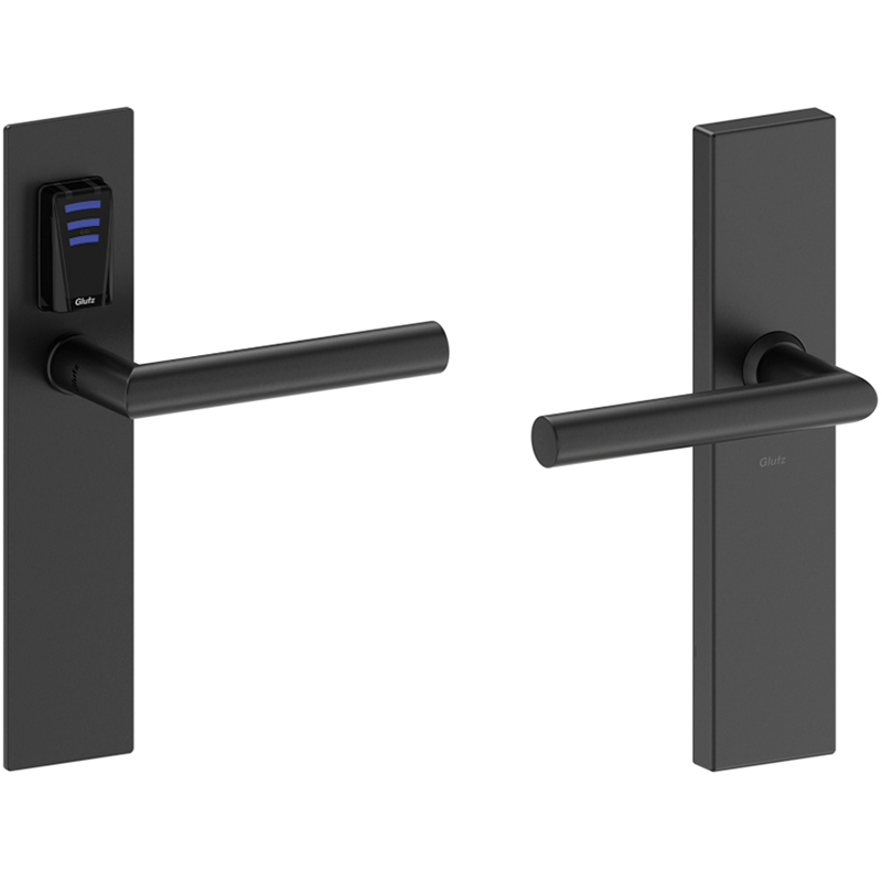Ferrure de sécurité électronique fonctionnant à piles pour portes pleines intérieures et extérieur, de l'extérieur, l'ouverture et la fermeture sont actionnées en lisant le support RFID, la poignée intérieure permet d'ouvrir la porte à tout moment, conformité à la norme EN179 assurée avec la poignée de porte adaptée