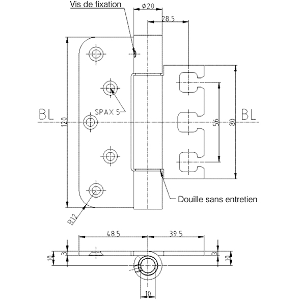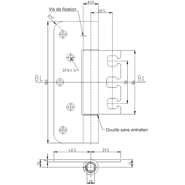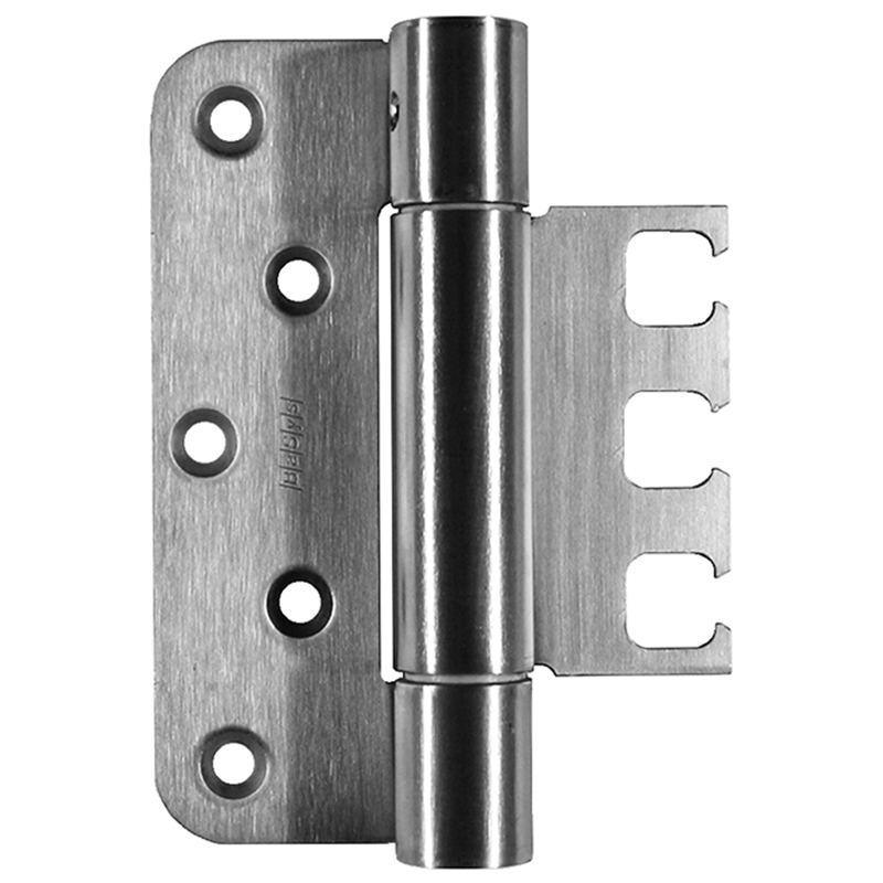 inox brossé, pour portes noyées, sans entretien, avec goupille de sécurité, construction démontable, épaisseur de platine 3 mm, jeu de fixation 14 mm, à partir d'une hauteur de 100 mm: pour l'utilisation sur des portes dans des voies d'évacuation et de secours avec des exigences en matière de protection contre la fumée et l'incendie, force portante, hauteur de platine 95 mm, avec 2 fiches env. 80 kg, force portante, hauteur de platine 120 mm, avec 2 fiches env. 100 kg, force portante, hauteur de platine 160 mm, avec 2 fiches env. 120 kg