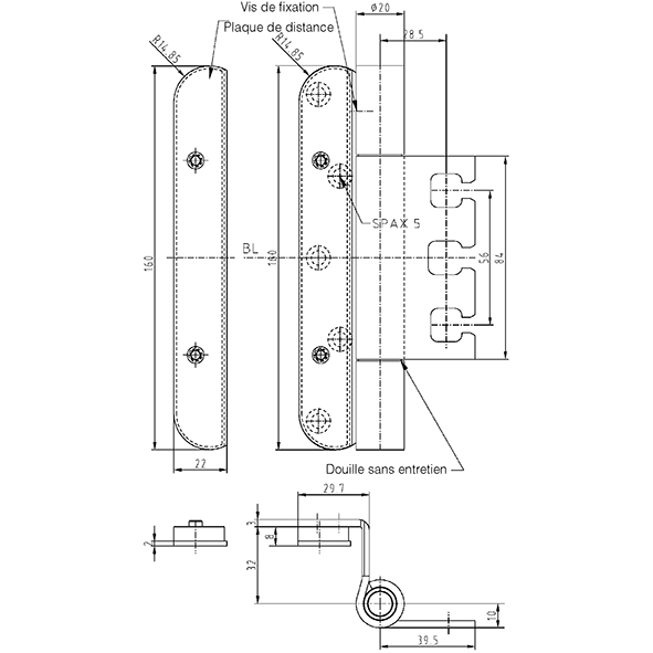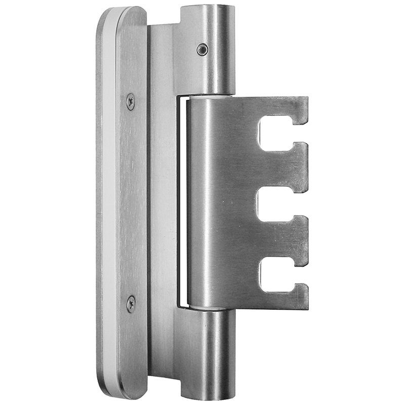 inox brossé, pour portes à recouvrement, avec joint continu, sans entretien, avec goupille de sécurité, construit un démontage, avec plaque de distance, épaisseur de platine 3 mm, pour joint de recouvrement 13 mm, pour l'utilisation sur des portes dans des voies d'évacuation et de secours avec des exigences en matière de protection contre la fumée et l'incendie, force portante avec 2 fiches env. 160 kg