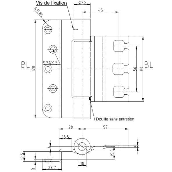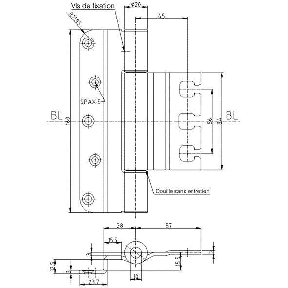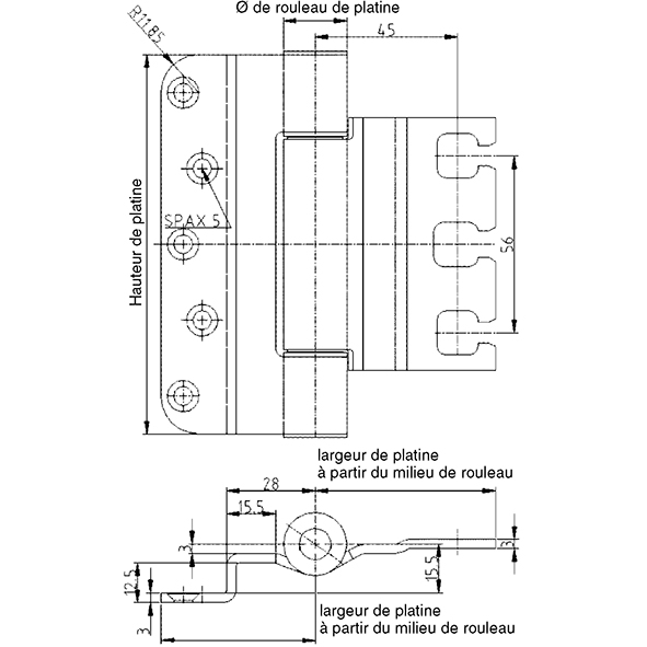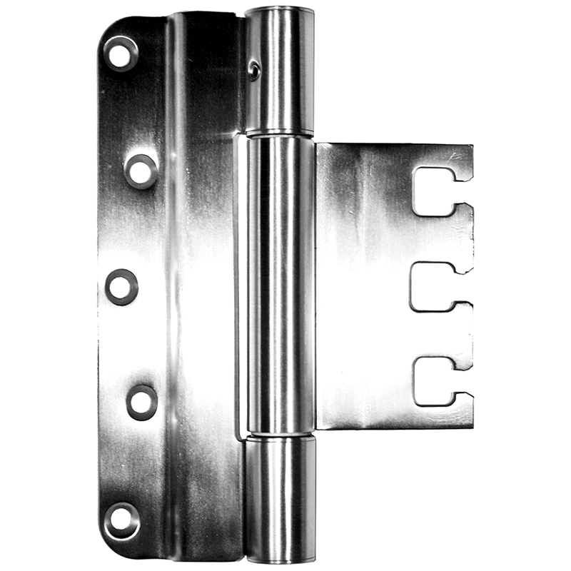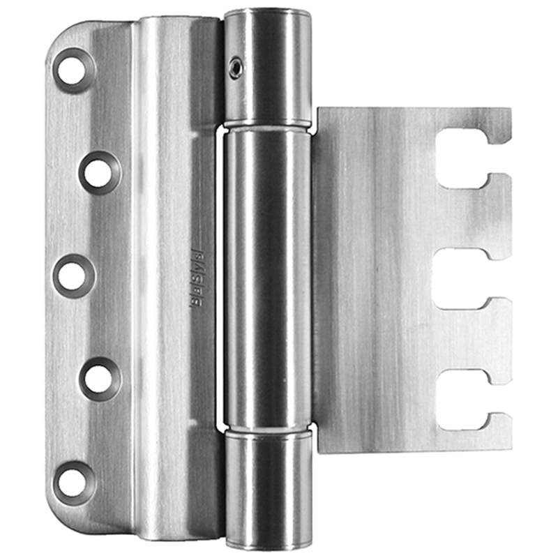 inox brossé, pour portes affleurantes à rainure, sans entretien, avec goupille de sécurité, construit un démontage, épaisseur de platine 3 mm, pour l'utilisation sur des portes dans des voies d'évacuation et de secours avec des exigences en matière de protection contre la fumée et l'incendie, force portante, hauteur de platine 120 mm, avec 2 fiches env. 100 kg,